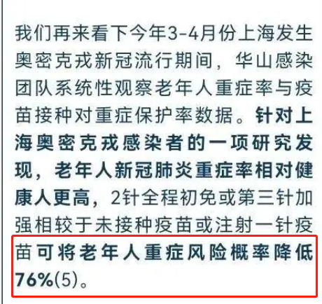 接种过2针或第3针加强针的,相较于未接种疫苗或只接种1针疫苗的,可将老年人重症风险率降低76%。